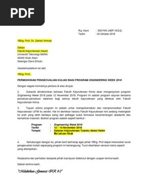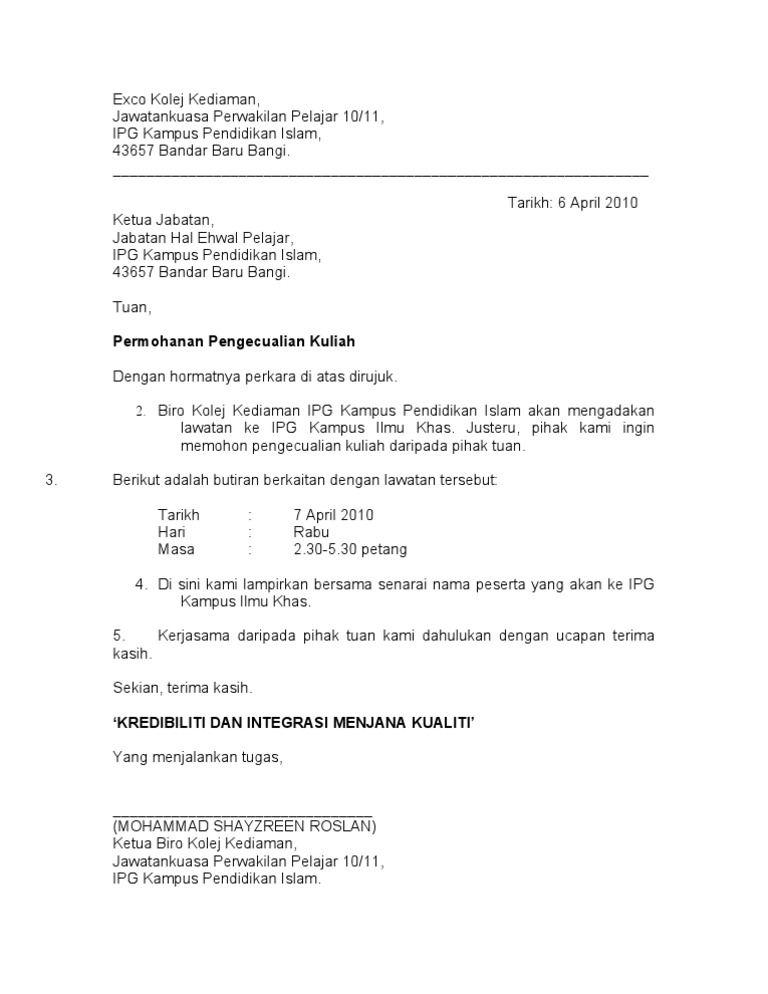 Surat Pengecualian Kuliah Exco Kolej Kediaman Pdf